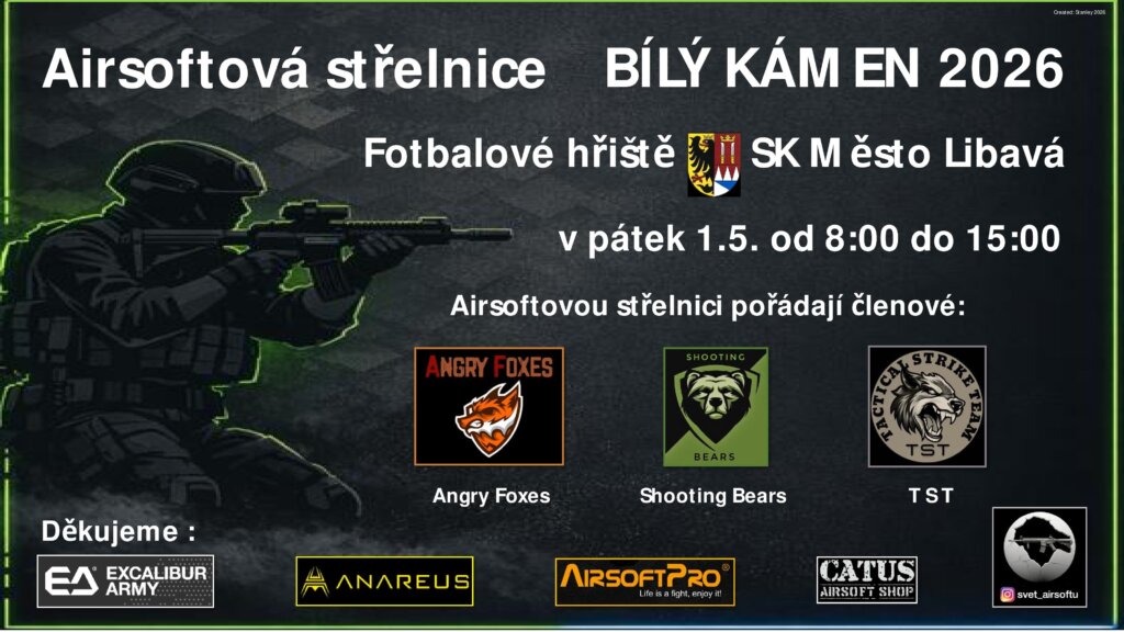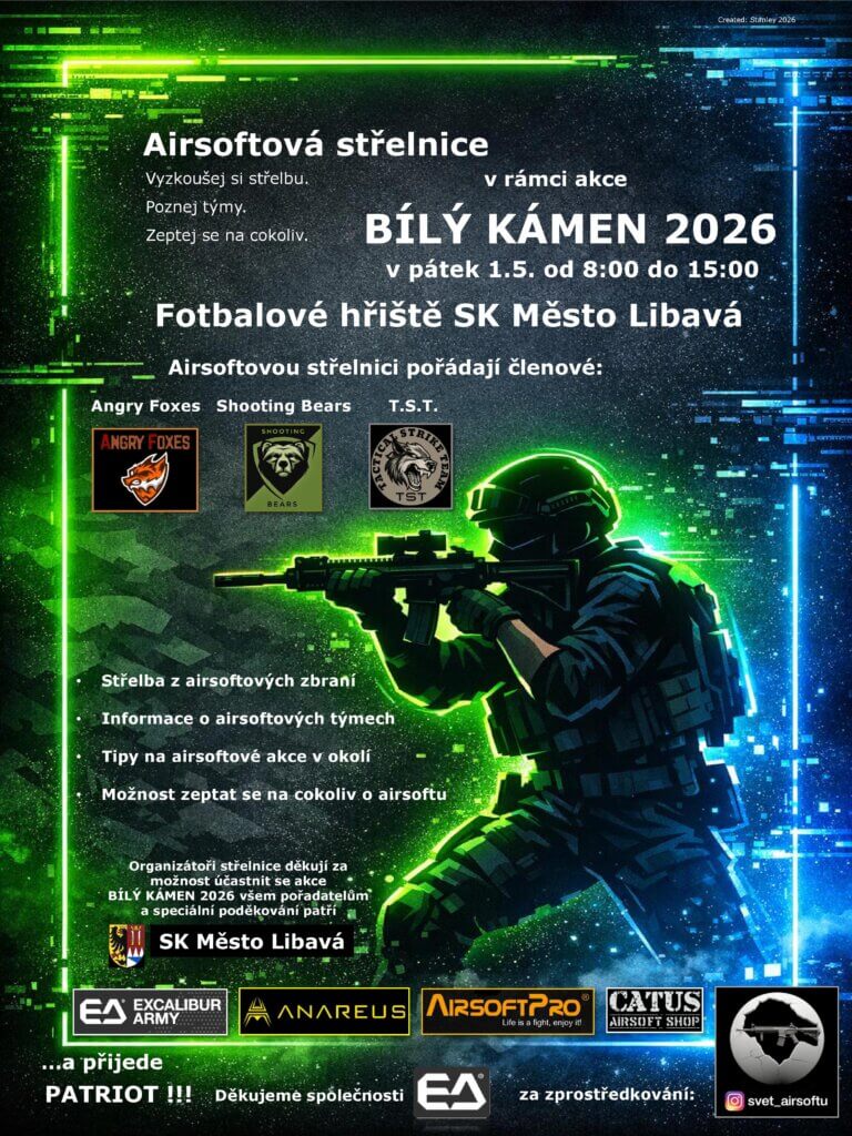 Na fotbalovém hřišti SK Město Libavá se v pátek 1. května 2026 od 8:00 do 15:00 uskuteční airsoftová střelnice v rámci akce Bílý kámen 2026.